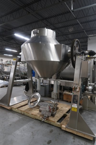 1-Used Gemco 50 Cubic Foot Stainless Steel Slant Cone Tumbling Blender, Serial Number GGM-24035. With “Gemcomatic” auto drum loading/unloading feature, blender last used in the pharmaceutical industry. On stainless steel legs, blender is rated 70 lbs./cf maximum density. Electrical specifications 3/60/460 Volt, blender can be shipped assembled or disassembled depending on buyer’s preference. With electric drive motor. (Stock #9031A)