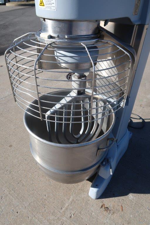 3-Used Hobart Model V-1401 Bowl Mixer, Serial Number 11-430-919. This 140-quart mixer was last used in a bakery and is driven by 5HP, 3/60/200 Volt motor. Equipped with safety cage, this multi-speed mixer has stainless steel bowl and is supplied with dolly. Supplied with buyer’s choice of mixing attachment (flat beater, whisk, or hook), other accessories available at additional cost. (Stock #8727A)