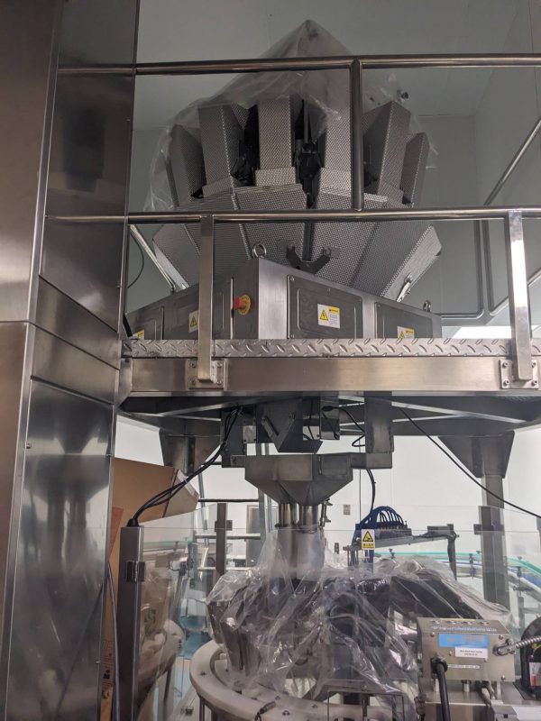1-Used Complete Gummy Bottling/Packaging Line. Suitable for both Gummies as well as Tablets, Capsules, and Lozenges, line consists of Bottle Unscrambler, bucket elevator, 14 head rotary scale mounted on rotary turret, Screw capper with cap elevator, pressure sensitive labelling machine, metal detector/checkweigher and full body sleever with heat tunnel. Line only used for test runs, so it remains in virtually unused condition. (Stock #L1457)