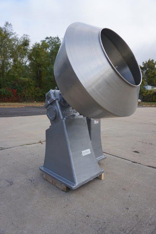 1-Used 42 In. Diameter Stainless Steel Coating Pan. Last used in the vitamin industry, Pan is equipped with internal baffles. Mounted on stand, Pan is driven by 3/60/220-440 Volt explosion proof motor. (Stock #8570A)