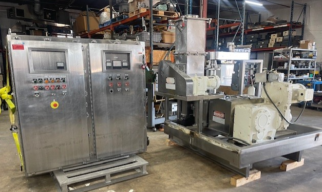 1-Used Fitzpatrick Model 4LX10D 316 stainless steel, free standing roller compactor/chilsonator. With onboard stainless steel Fitzmill, Model DKASO12 knife rotor hammer mill. The system is rated from 250 – 400 kg of product per hour,  depending on materials, application and machine configuration and environment being run in. Equipped with 4″ OD horizontal metering screw with 1 HP motor drive that eliminates vacuum dearation to 4 OD” vertical pre-compression screw with 5 HP motor drive, that compresses product for more uniformity prior to feeding into the 4″ OD x 10″ long face cored product compaction rollers. With 7.5 HP motor drive and bulk densities of feed from 10 to 100 lbs. per cubic foot and roll force of 17.5 KN/cm with roll gap range of 1mm to 6mm. Horizontal screws, variable frequency speed controls with start and stop push buttons and e-stop. Mounted on (4) stainless steel legs. (Stock #L2055)