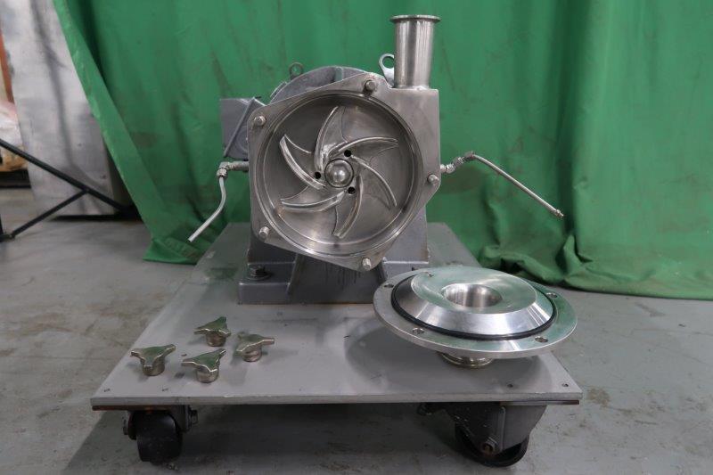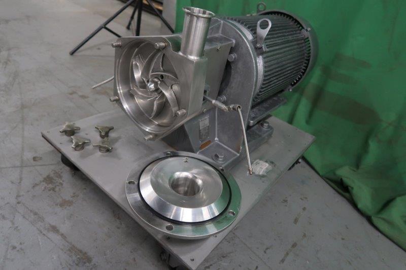 1-Used Fristam Stainless Steel Sanitary Centrifugal Pump, Model FP1742200, Serial Number 142169102. Equipped with approximately 3 In. diameter inlet and 2 In. diameter Tri-Clamp ports, pump is driven by 15 HP/3.75 HP, 3/60/460 Volt two-speed motor, providing for 3,530/1765 RPM. Last used in the food industry, pump is on casters. (Stock #9013P)