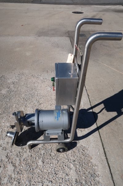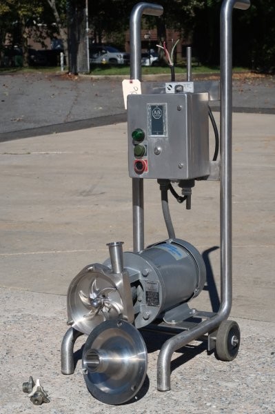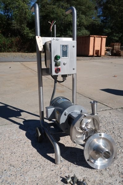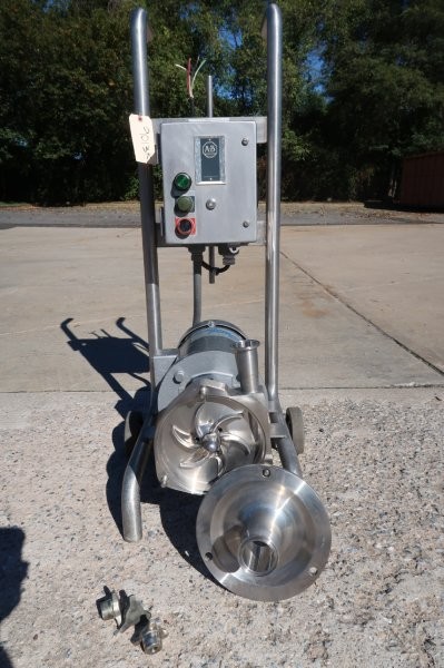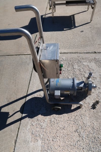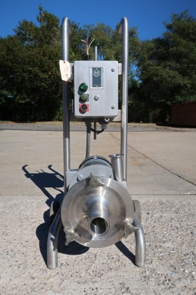 1-Used Fristam FPX Series Stainless Steel Sanitary Centrifugal Pump, Model FPX712-130, Serial number 12168237. Equipped with approximately 1.5 In. diameter inlet and outlet Tri-Clamp ports, pump is mounted on stainless steel cart with casters for portability. Driven by 3 HP, 3/60/208-230/460 Volt motor, pump is equipped with stainless steel starter box. Last used in the food industry (Stock #9013K)