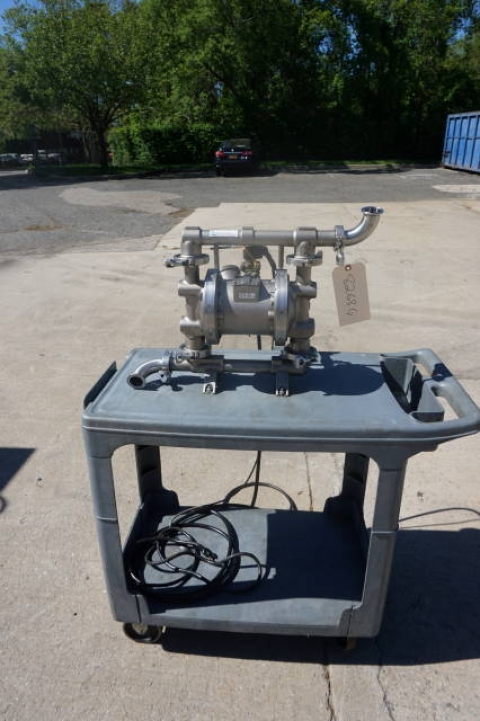 1-Pre-Owned Graco Stainless Steel Air Operated Double Diaphragm Pump Model FD1111, S/N 24A13A. With approx. 1-1/2 in. diameter Tri-Clamp inlet and outlet ports, Pump rated 41 to 159 maximum gpm. Mounted on portable cart. Last used in food industry. (Stock # 8268G)