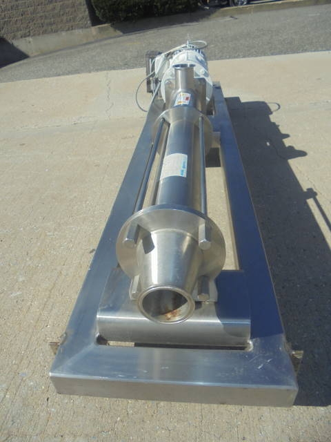 1-Used Moyno 3 in. X 3 in. Stainless Steel Sanitary Progressive Cavity Pump, S/N AS2243598 AJ (FB2F-XSE-SAA). On portable stainless steel base. This A3 Series sanitary pump is driven by 3 HP 3/60/230-460 volt motor and has Fuji variable frequency drive. (Stock #7831A)