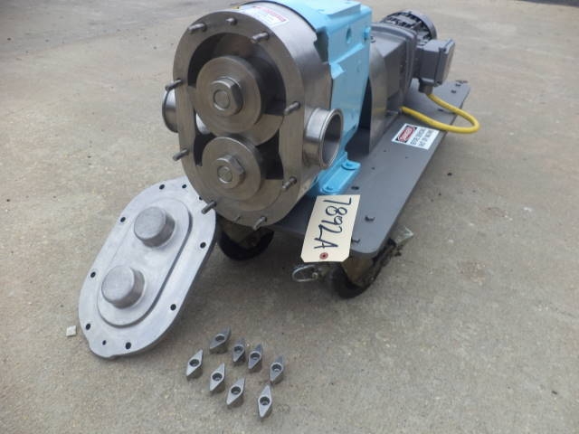 1-Used Waukesha Model 130 Stainless Steel Positive Displacement Pump, S/N 11526SS. Equipped with approx. 3 in. diameter tri-clamp inlet and outlet port, Pump on base driven by 5 HP 3/60/208-230-460 volt motor. (Stock #7892A)