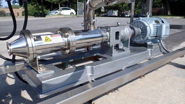 1 – Used Wen Zhuo Model G45 Stainless Steel Positive Displacement “Progressive Cavity” Pump.  Suitable for viscous liquids and creams, pump has approximately 2 In. diameter Tri-Clamp inlet and outlet ports, stainless steel feed piping shown in photos,  and is driven by 5.5 KW 3/60/220 Volt motor. Equipped with Yaskawa variable frequency drive for variable speed operation and a starter box, pump can be supplied with stainless steel stand shown at additional cost. (Stock # 8735Z)