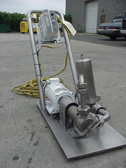 1-Used jabsco “pureflo” model 15030-0665 stainless steel rotary pump with approx. 1-1/2″ diameter inlet and outlet ports. Pump has stainless piping, which holds a stainless filter housing. Mounted on stainless base, pump is driven by 1hp drive motor with variable speed control.