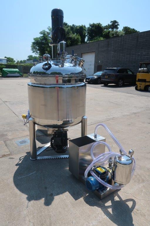 1-Hundom 500 Liter (Approximately 125 Gallon) Polished Stainless Steel Self-Contained Electric Jacketed Emulsifying Kettle/Reactor, Serial Number 20240426. This Vacuum kettle/reactor is equipped with scraped surface frame type agitation driven by 3 kW (4 HP), 3/60/220 Volt motor, along with bottom entering high-speed homogenizing mixer, separately driven by 7.5 kW (10 HP) 3/60/220 Volt motor. Scraper agitator has variable speed control allowing for speeds 0 to 35 RPM. Homogenizing head has variable speed control, allowing for speeds from 0 to 2,800 RPM. With bolted dome top with assorted openings including manway with hinged lid, vessel has light instrument and dished bottom head. Equipped with control panel reactor has approximately 2 In. diameter center bottom outlet with hand-operated valve, with Tri-clamp fitting. In new condition, comes equipped with motorized liquid ring vacuum pump. (Stock #8882)
