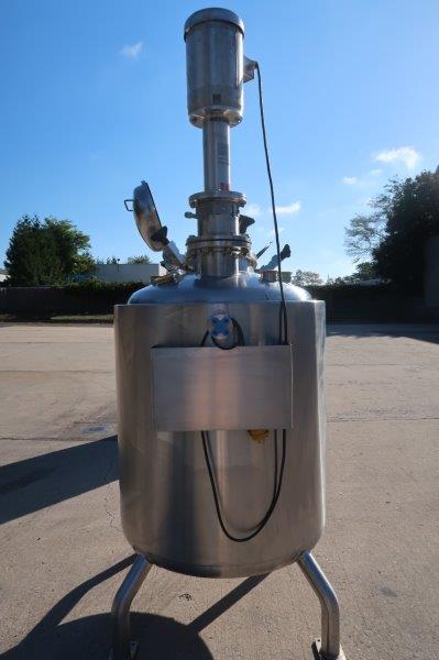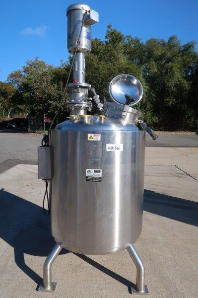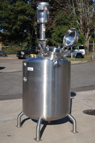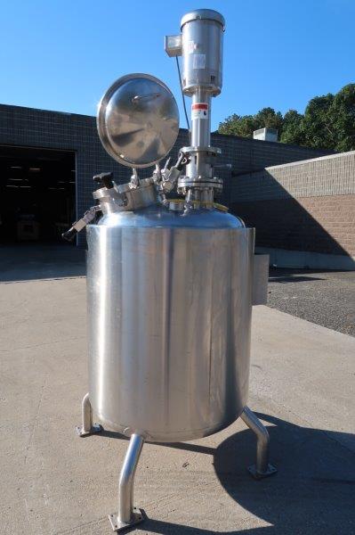 1-Used Allegheny Bradford 600 Liter (168 Gallon) Stainless Steel Sanitary Jacketed Vacuum Reactor, Serial Number 021567-1-1. Interior dimensions approximately 34 In. diameter X 44 In. on straight side, plus dished top and bottom heads. Vessel is rated full vacuum and is jacket rated for 100 PSI@275 Deg. F. as well as internally rated at 125 PSI@275 Deg. F., National Board number 4273, Code Stamped. Top head has 15 In. diameter off-center manway with hinged lid, as well as approximately seven additional top inlets. Equipped with top mounted Admix “Rotosolver” Model 112RS88SS Stainless Steel High Shear Mixer, Serial number 24715-1, which is driven by 7.5 HP 3/60/208-230/460 Volt motor. On stainless stee legs, vessel has center bottom Tri-Clamp discharge. Last used in a completely sanitary application. (Stock #9013G)