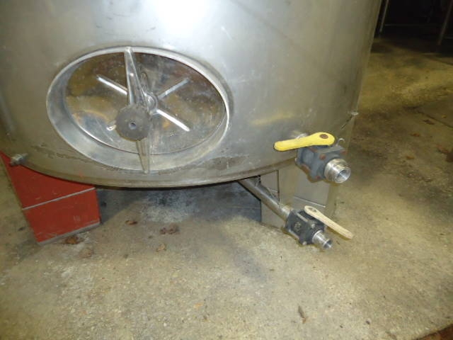 1-Used approx. 1,000 Gallon Stainless Steel Vertical Cone Bottom Tank. Dimensions approx. 60 in. diameter X 76 in. straight side plus cone bottom. With approx. 1-1/2 in. diameter center bottom outlet with elbow, Tank mounted on approx. 20 in. high “block” legs. Last used in wine production. (Stock #L1240)