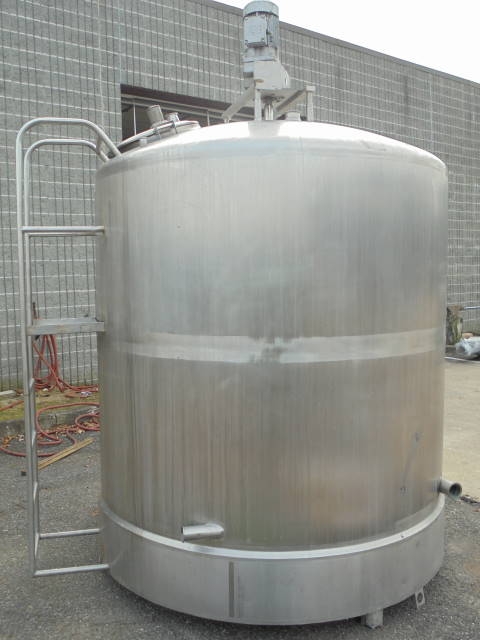 1-Used Cherry Burrell 1,500 Gallon Stainless Steel Vertical Closed Mixing Tank, Model “SP”, S/N 1500-82-791. Dimensions approximately 76 in. diameter X 78 in. deep plus sloped bottom head. With side mounted staircase, tank has dual 36 in. diameter twin pitched bladed agitation with Eurodrive 5HP, 3/60/230-460 Volt top mounted motor drive and stabilizing bearing for agitator shaft. Dished top head has 20 in. diameter off-center manway with hinged lid and four assorted smaller inlets. With approximately 3 in. diameter and 3-1/2 in. diameter bottom outlets with Tri-clamp fittings. (Stock # 8174B)