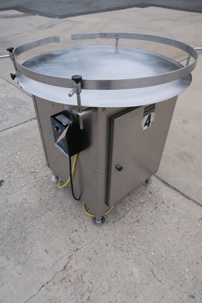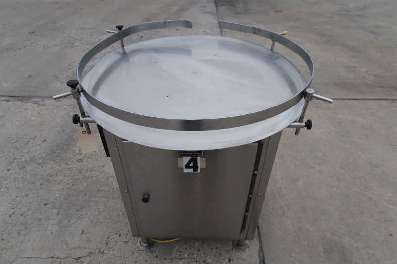 1-Used Modular Packaging 36 In. Diameter Stainless Steel Rotary Unscrambling/Accumulating Table. Last used in the nutritional/supplement industry, table has single phase electrics with a “Penta Drive” variable speed control. (Stock #9019G)
